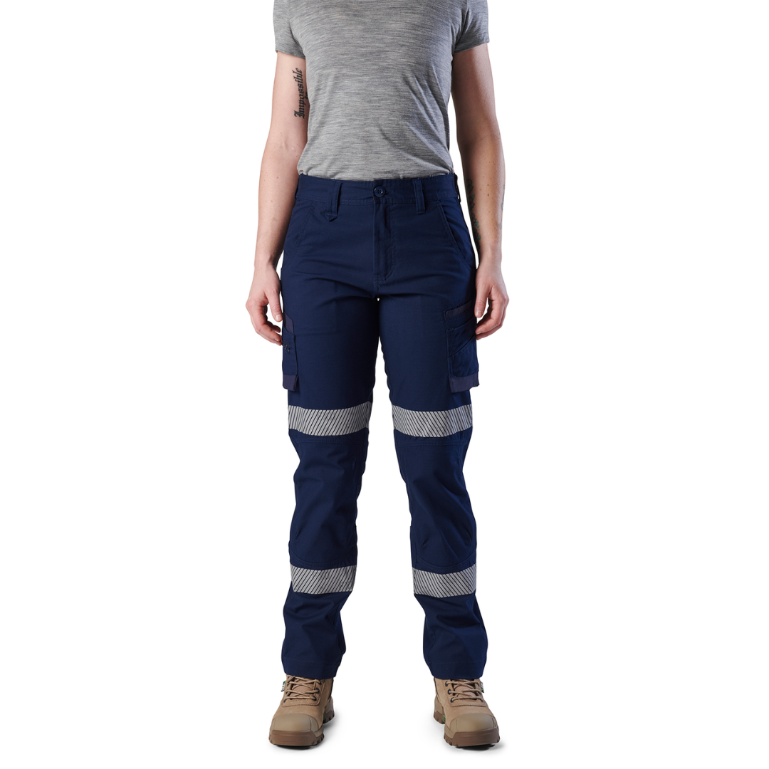 Introducing the FXD Women's WP.7W Taped Stretch Ripstop Work Pants, featuring Australian standard compliant AS/NZS 1906:4:2023 segmented biomotion reflective taping and double weave flex hip panels for a superior fit and maximum range of movement. The fabric is a 260 GSM lightweight stretch ripstop blend of 60% cotton, 38% polyester, and 2% elastane. These pants are meticulously designed with various features, including an extended back waistband, floating cargo pockets, Dura500™ advanced nylon and polyurethane abrasion panels, inleg gusset, knee darts, YKK™ nylon coil zippers, and 50+ UPF protection. Available in Navy and multiple sizes, these work pants are ideal for women seeking comfort, functionality, and compliance.